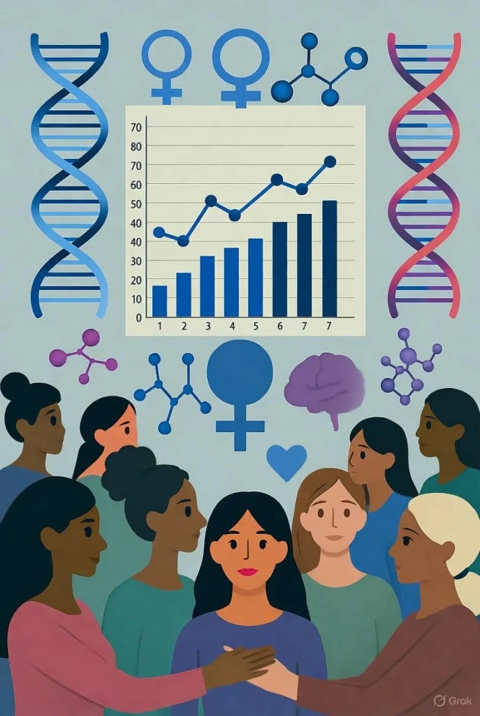In addition, the interplay of genes and hormones is thought to increase the risk for females. During puberty, menstruation, and the reproductive cycle, as well as through the menopause transition, dramatic hormonal changes have been associated with greater depressive episodes. Heightened genetic sensitivity may worsen these effects. Depression-related genetics and some metabolic characteristics, particularly in women, including body mass index (BMI), further underscore the association.